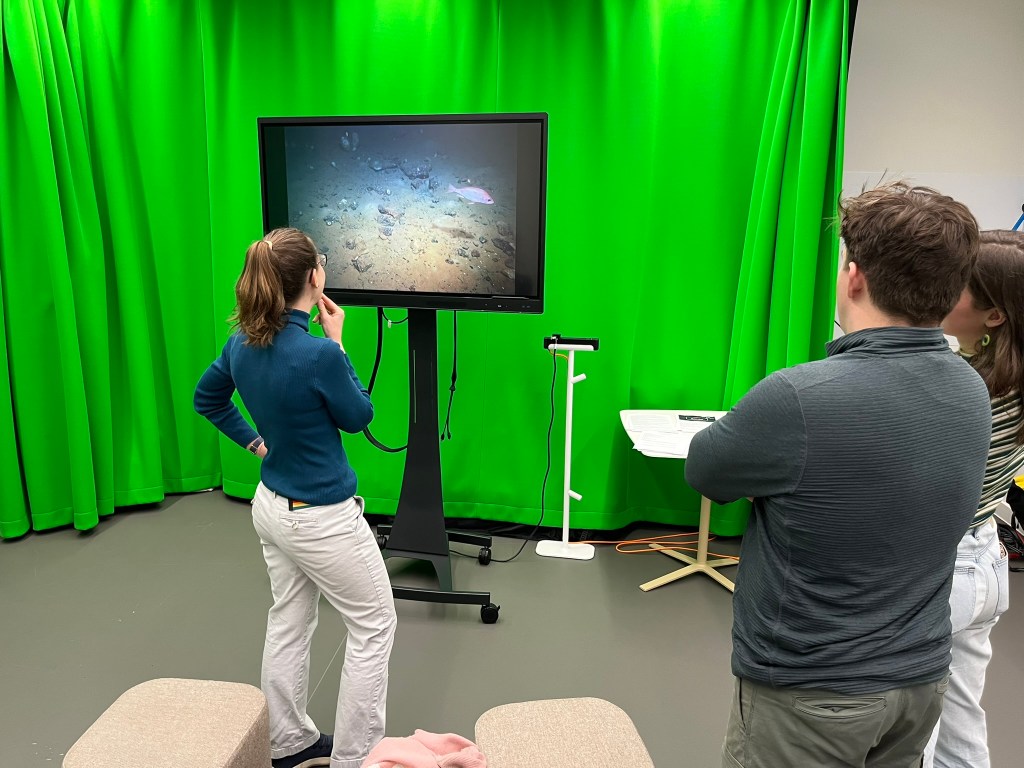 Sound room: In this room you are experiencing the soundscape of a deep-sea sponge ground. Sounds and images were collected in this sponge ground. Here, you are surrounded by acoustic data points, organised in clouds based on their similarity. While touching and hearing the sounds, you can explore if they correlate to any of the fish and crabs seen in the image data. Dr. Laurence De Clippele is currently investigating which species produce which sounds using both manual and machine-learning approaches. The data are from a Canadian sponge ground at a depth of 150-200 m.